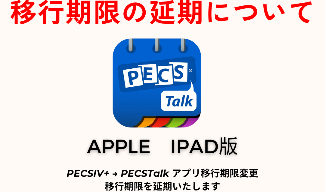 注2:PECSIV+からPECSTalkへの無料移行は2025年12月31日まで可能です。2025年3月以降はPECSIV+はIOSからサービスが終了致しますのでご了承ください。