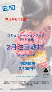 ホームページ » ニュース » 特別セール!2月26日から28日まで開催 特別セール!2月26日から28日まで開催 2月 26, 2025 新学期の準備にかねて本日26日から2月28日までの間コミュニケーションブック(中)サイズが2300円でお求めできます。 この機会をお見逃しなく!中敷きの色の詳細は弊社教材ページをご参照ください。