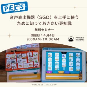 新しい環境の中でも引き続きPECS🄬を使ってコミュニケーション支援をしていくにあたって、どのようにPECSについて説明したらよいのですか?というお問い合わせをいただきます。こちらのリンクからPECSについて簡単にまとめたものが弊社ホームぺージよりダウンロードして頂けます。ご参考までに。