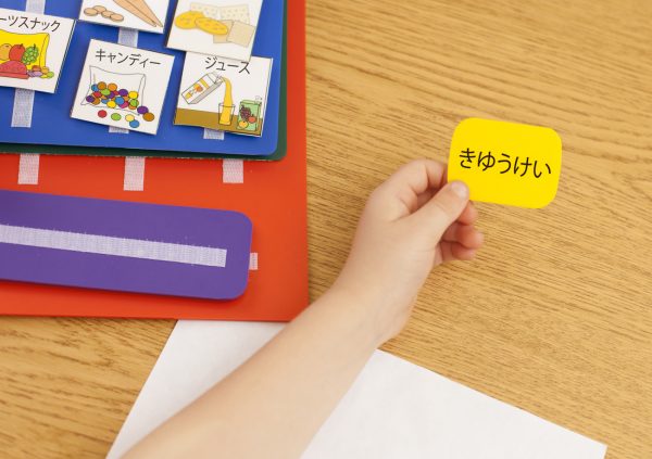 生徒は休憩を取りたい時、このカードを先生や家族に渡しその意思を伝えます。自発的に要求できるようになったら、一定の時間内で回数に制限がある中で休憩をとることができるようにトレーニングします。